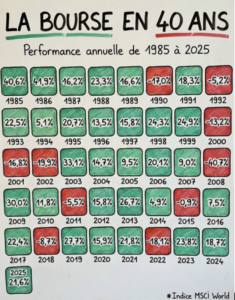 Les crises financières, les tensions économiques ou les événements géopolitiques provoquent souvent des corrections temporaires. Pourtant, sur plusieurs décennies, la trajectoire reste globalement orientée à la hausse.